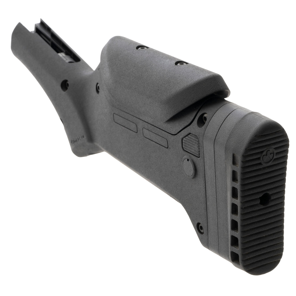 The ELG M-LOK Stock is designed to provide Marlin lever-action rifle shooters a stock with maximum adaptability that optimizes their iconic firearm. With adjustable length-of-pull (LOP) and comb height for various types of optics, storage of extra ammunition or accessories in a weatherized portion of the stock, and the ability to attach various Magpul M-LOK accessories and slings, Magpul brings new capability to the lever-action rifle. The stock allows for 1.5 inches of overall LOP adjustment (from 12.5" to 14.0" in 0.5" increments.) It also ships with a cheek riser and two (2) 0.25" shims for a total comb height adjustment of 0.75", which attaches to the internal storage compartment door. The stock has an internal storage area, complete with a quiver for six (6) .45-70 Gov't or 30-30 Win cartridges, and an open storage compartment insert. The ELG M-LOK Stock also accepts Magpul Type 1 and Type 2 QD cups for a mounting a sling, and two (2) M-LOK slots reside on each side for further accessory mounting options such as an ammo saddle. Rounding out the stock's state-of-the-art feature set is a sling swivel located in the bottom of the pistol grip which allows for shorter slings and a higher muzzle-down carry option.