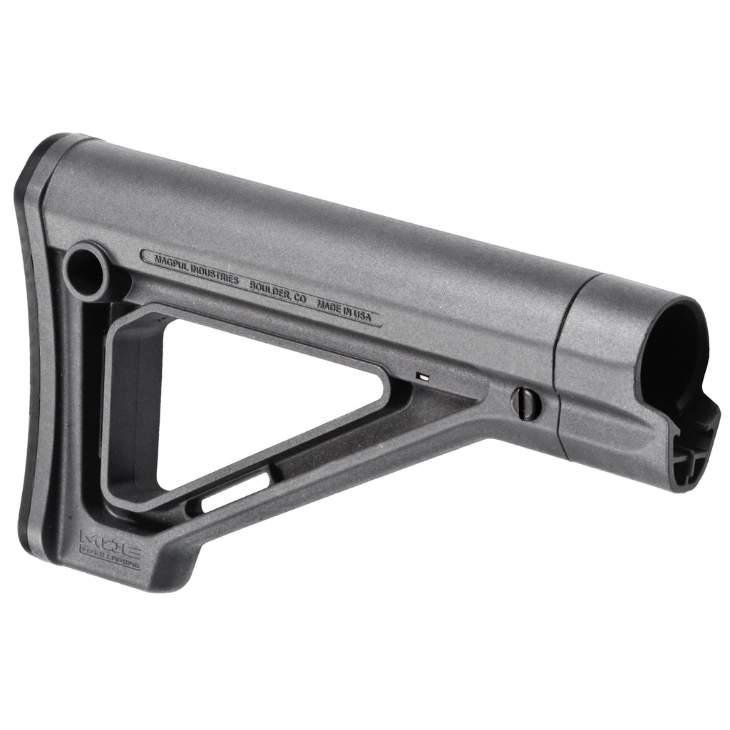 The MOE Fixed Carbine Stock - Mil-Spec Model (Magpul Original Equipment) provides an inexpensive, fixed, non-collapsing stock option for mil-spec size carbine-length buffer tubes. The MOE Fixed Carbine Stock has a slim profile, improved cheek weld, and multiple sling attachment options, and is compatible with ASAP Plates and PRS Extended Rubber Butt-Pad. Installation is non-armorer and does not require the castle nut or lock plate to be removed. Made in U.S.A.