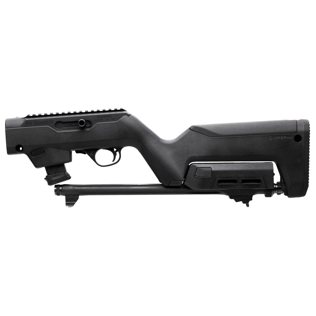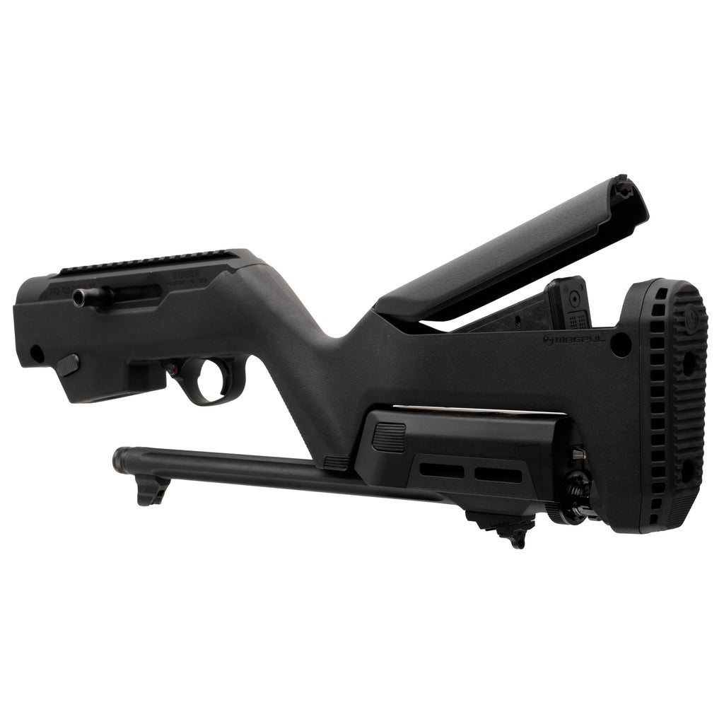 The Magpul PC Backpacker Stock for the Ruger PC Carbine is the ultimate option for those wanting to bring advanced ergonomics and portability to their Ruger PC Carbine rifle. With a similar look and functionality as The X-22 Backpacker stock, it offers a minimalist solution for the hunter or outdoorsman and was designed for those who want to transport their carbine in an efficient, convenient package without compromising shooting performance or ease of deployment. The PC Backpacker is constructed of Magpul's advanced polymer, featuring an ergonomic hand guard with M-LOK slots at the 3 & 9 o'clock positions and interchangeable cheek risers to accommodate for various sighting options. The PC Backpacker stock also features an MOE SL rubber butt-pad offering an anti-slip surface that increases impact protection and is compatible with the MOE SL Enhanced Rubber Butt-Pad for an additional 3/8" LOP. Using a unique locking interface that attaches the barrel assembly to the receiver, the PC Backpacker provides an efficient solution for storage during transportation while maintaining convenient assembly from the stowed position. By including multiple QD cup mounting locations, Magpul has made it easy to carry your Ruger PC Carbine in either the broken down or assembled state with the Magpul Sling Mount Kit-Type 1 & Type 2. They've also integrated two convenient storage locations. The first is a water-resistant grip storage compartment that provides an at-hand location for a small multi-tool, survival equipment, or cleaning equipment. The second is a compartment in the riser section that's ideal for a single pistol magazine, fitting up to the PMAG 21 GL9.