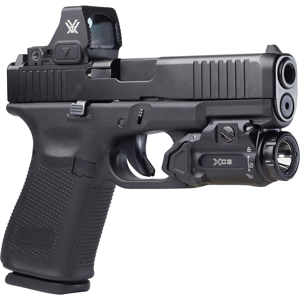Duty Grade For Your Compact Handgun. Lightweight, compact, and robust, the XC3 is ideal for duty use as well as concealed-carry handgun applications. It is engineered to perform in any high-stress, low-light environment where positive ID is imperative, and its slim, compact form factor is compatible with many commercially available holsters already on the market. The XC3's premium LED generates 550 lumens and 7,200 candela of intense white light shaped a Hybrid Beam pattern that delivers the ideal combination of distance and surround light at handgun distances, so you can maintain focus on any threat while remaining aware of your surroundings. Surefire has also engineered its intuitive ambidextrous switching to provide a positive tactile feel for unmatched control in momentary- or constant-on mode, so you'll never have to worry when it is time to illuminate your target. Powered by a front-loading, single, readily available 123A lithium battery, the XC3 provides 1.75 hours of constant runtime while allowing easy battery swaps without requiring removal from your handgun. Manufactured of high-strength, aerospace-grade aluminum body, Mil-Spec hard-anodized, and gasket-sealed to thrive in the harshest conditions, it is the new standard in duty-grade compact handgun weapon lights.